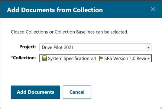 Enfin, les documents contenus dans une Collection peuvent être "réutilisés" d'une Collection à une autre, y compris entre projets. En une seule opération, vous pouvez ajouter l'ensemble des documents d'une Collection à celle courante sans avoir à ajouter manuellement chacun des documents dans une version ou Baseline donnée.