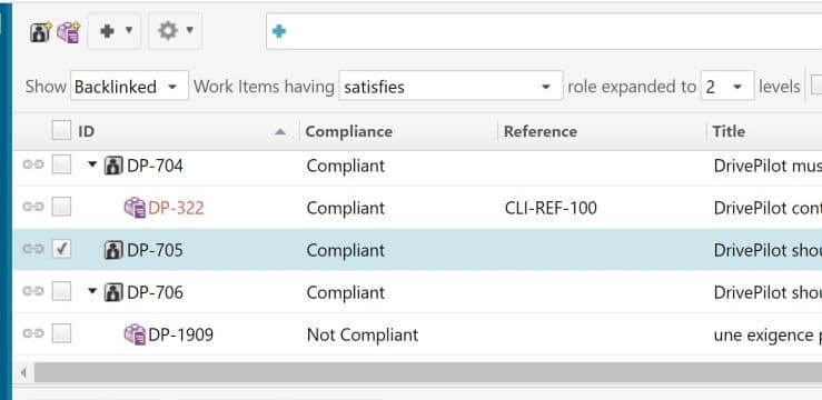 Cependant, sans filtre de couverture ajouté Polarion nous propose dans cette liste toutes les exigences utilisateurs parentes, qu'elles soient couvertes ou non (c'est le cas de l'exigence DP-705). Nous utilisons donc d'autres moyens pour cibler cette couverture entre Work Items.