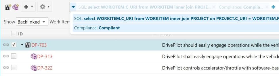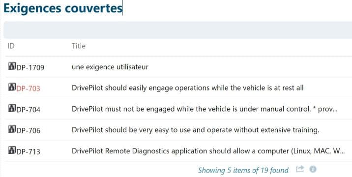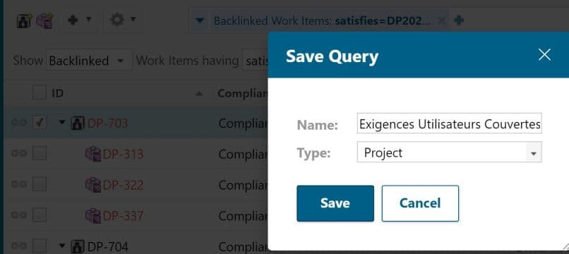 - L'inverse étant NOT backlinkedWorkItems:satisfie=DP2021*) pour retourner les exigences utilisateurs qui ne sont pas couvertes.