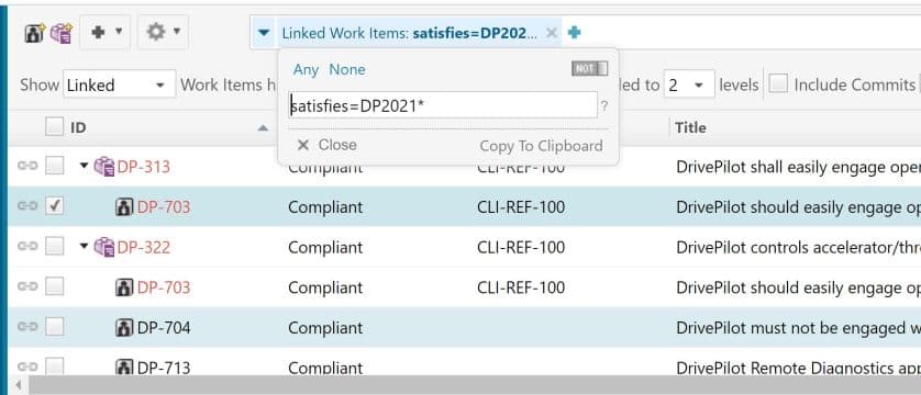 - L'inverse étant NOT linkedWorkItems:satisfie=DP2021* pour retourner les exigences fonctionnelles qui ne sont pas couvertes.