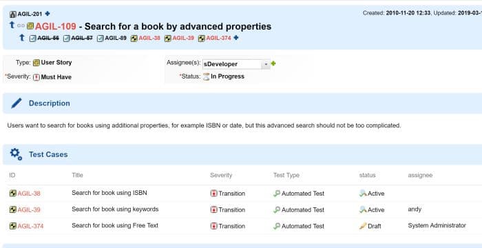 Prenons le cas d'une User Story, ci-dessous AGIL-38/39/374, qui est liée à des cas de tests. On voit les liens vers ces tests dans le bandeau du Work Item, et aussi bien entendu dans la section Linked Work Items.