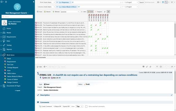 Tout d'abord, la vue Tree qui est facilement accessible. Au-delà de suivre les liens entre plusieurs Work Items, nous apprécions surtout le fait de pouvoir cliquer sur chaque ligne, et ainsi modifier une exigence, un risque ou une cause sans changer d'affichage. Nous pouvons aussi afficher dans la vue table les colonnes des différents Work Items. Par exemple, le Severity Rating vient avec le risque, alors que le New Severity résulte de la mitigation (Fmea Actions).