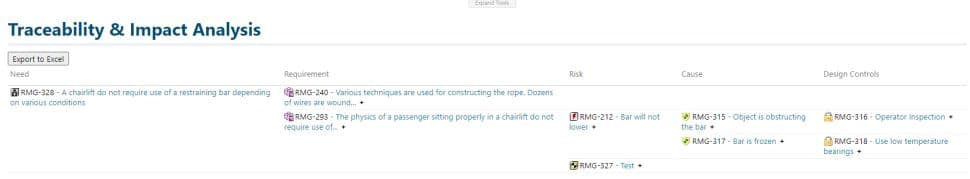 Pour produire des rapports , l'utilisation d'un widget graphique Multilevel Traceability (déjà couvert dans une précédente newsletter) permet de choisir aisément sa représentation des liens. Notez que nous pouvons aussi faire du "sur mesure", si vous avez besoin d'un tableau de traçabilité dans un format spécifique avec par exemple des attributs présentés en colonnes. Vous pouvez aussi aisément exporter ces vues de traçabilité en un seul clic sous un format Excel (notez le bouton Export to Excel, encore un widget !)