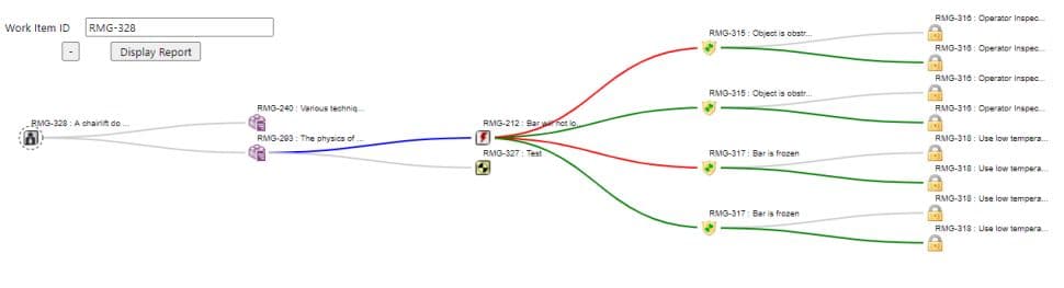 Enfin , pour une vue « arbre » des relations à partir d’un Work Item donné, l’utilisation d’un widget nommé Graphical and Tabular Impact Analysis Widget permet d’obtenir une vue d’ensemble des liens, et de naviguer d’un simple clic sur chaque élément de l’arbre. Dans le cas illustré ici, la vue permet de partir de l’exigence client vers la tâche mitigeant le risque associé, en permettant tout aussi bien d’ouvrir pour revue ou modification les éléments de gestion intermédiaires, que sont les Work Items dédiés à la gestion du risque pour cette exigence de départ.