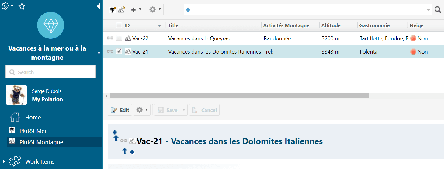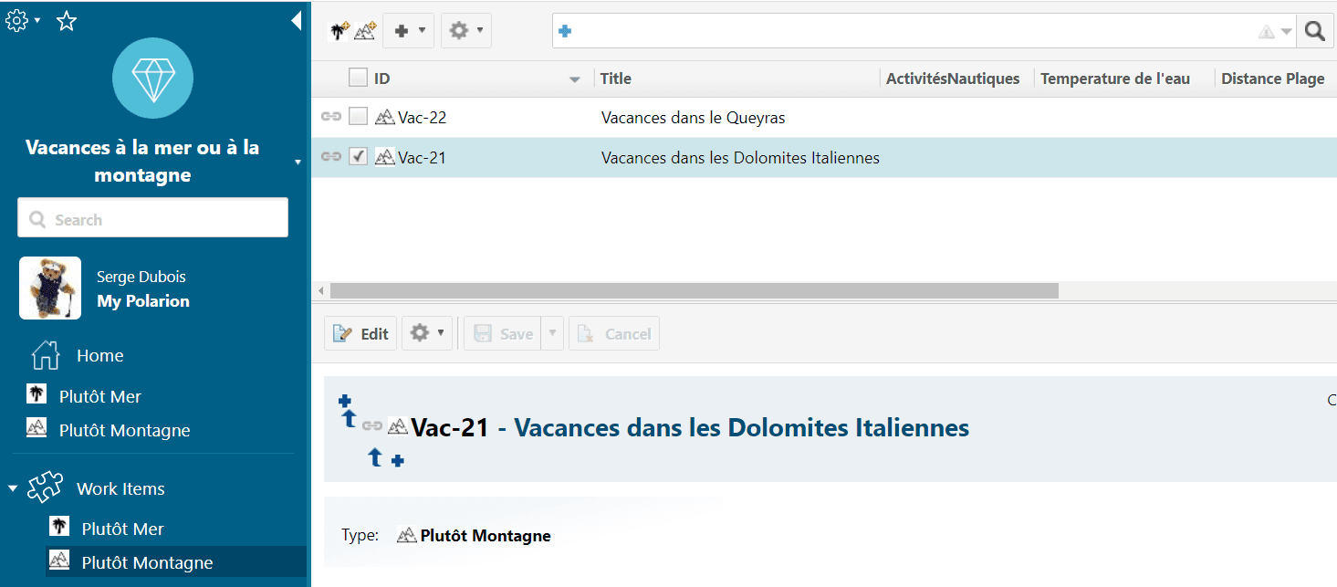 Cette rubrique a pour but de vous apporter quelques trucs et astuces pour faciliter votre quotidien avec Polarion. Ces conseils proviennent des experts Polarsoft mais aussi de l’écosystème Polarion France : clients, partenaires, consultants que nous encourageons vivement à nous faire part de leurs conseils, astuces et autres avis pour une prochaine publication ! L’article de cette newsletter a pour but d’expliquer comment se créer une vue personnalisée par type de Work Items Vous connaissez la vue table de Polarion qui permet de faire des recherches dans le projet et afficher sous forme de tableau les données de ces Work Items. Peut-être avez-vous remarqué que lorsque vous passez d’un type de Work Item à un autre, vous n’obtenez pas exactement le résultat attendu en terme de présentation des données dans ce tableau. Nous allons vous présenter comment améliorer cette restitution d’informations. Dans cette rubrique, nous parlons souvent d’exigences et de cas de tests, en cette période estivale et de vacances, nous allons illustrer notre sujet avec deux Work Items, Plutôt Mer ou Plutôt Montagne ? Comme nous le voyons ci-dessous, nous avons différents attributs pour nos vacances à la mer, comme les activités nautiques, la température de l’eau, etc. Quand nous sélectionnons ce Work Item, ce sont ces colonnes que nous voulons voir afficher dans le tableau.