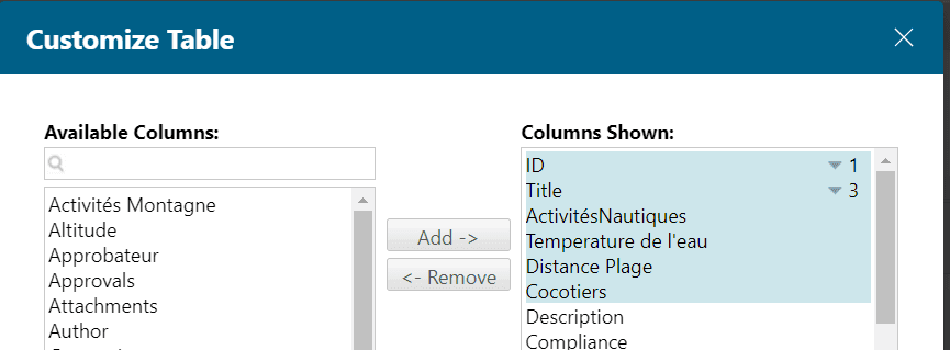 Quelle alternative et solution avons-nous pour afficher les données en fonction du contexte ? Utiliser les Shortcuts Favorites. Personnaliser la vue table des Work Items en sélectionnant les colonnes désirées comme ci-dessous :