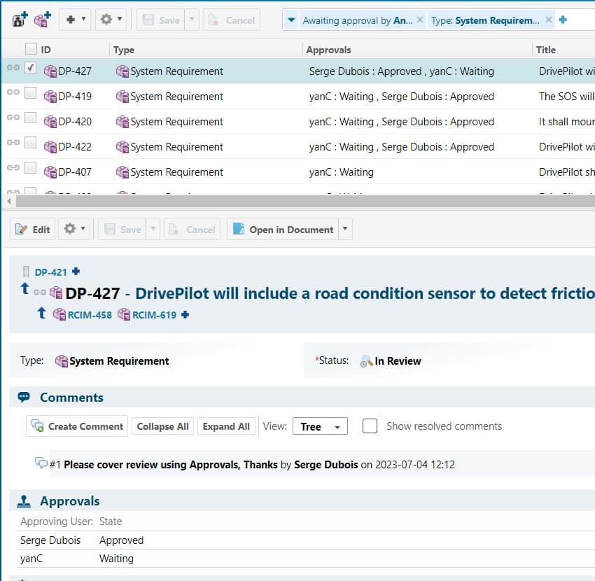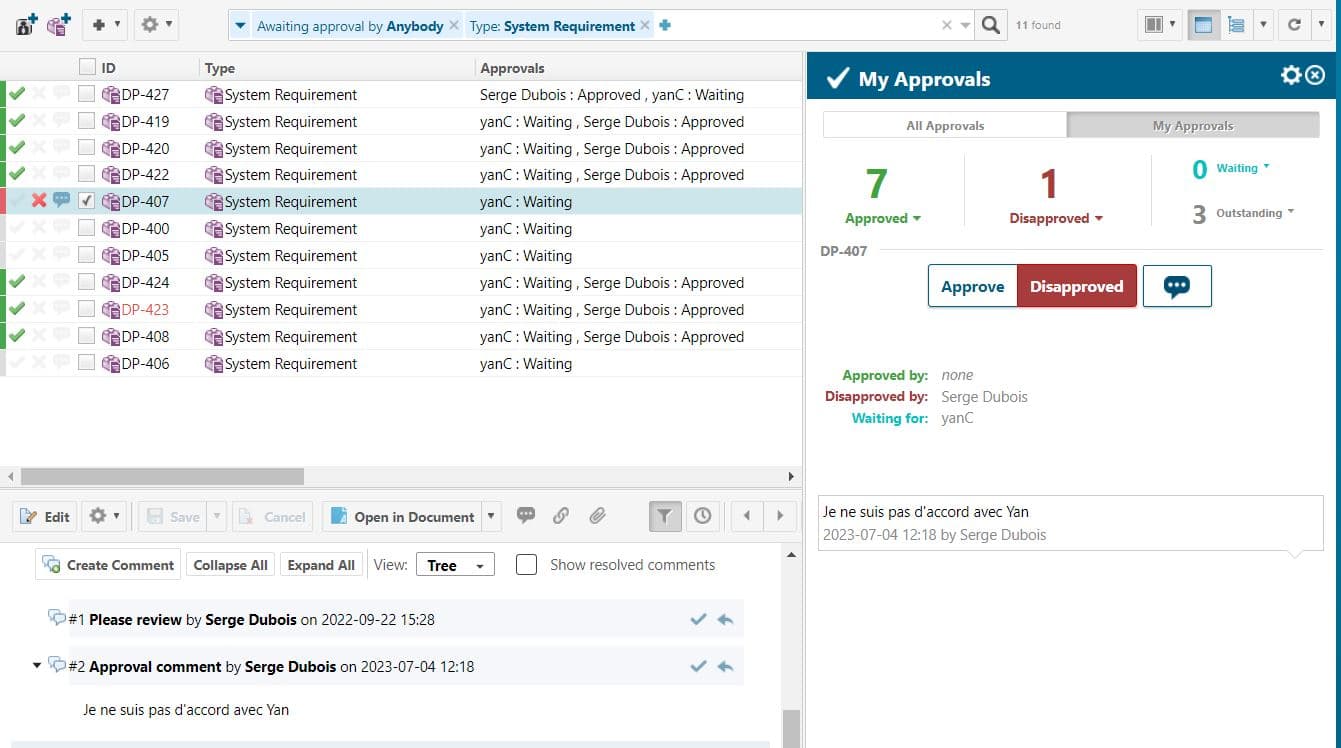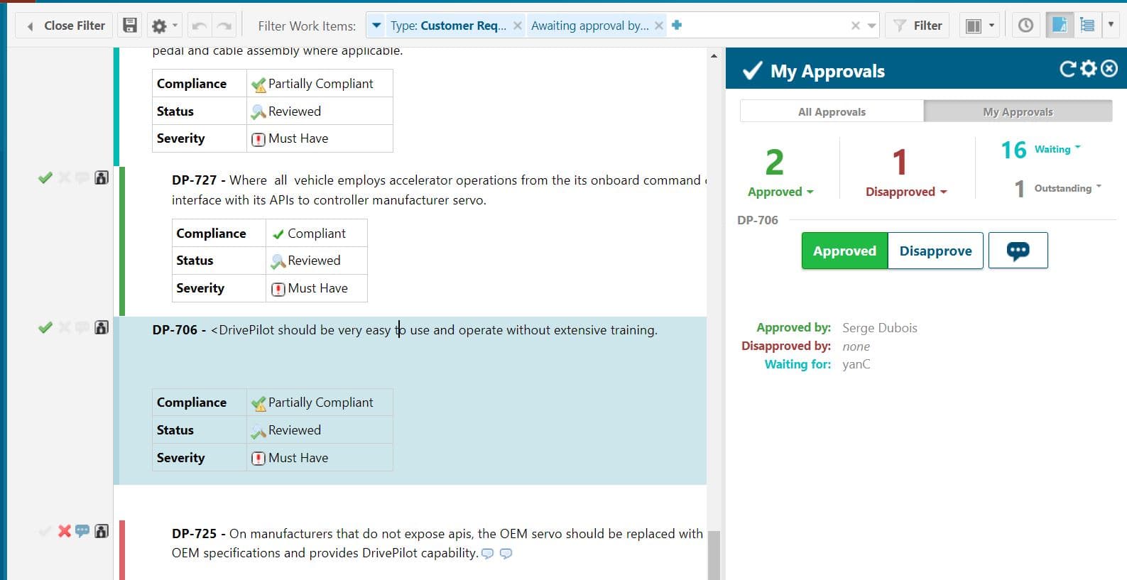 Comment se présente les approbations en vue document ? Comme toujours avec Polarion, ce qui est possible en vue tableau l’est également en vue document ! Ainsi pour rester dans le contexte du document, la vue My Approvals peut être affichée et on retrouve en face de chaque exigence les pictogrammes permettant d’approuver, désapprouver, et commenter notre exigence en revue.