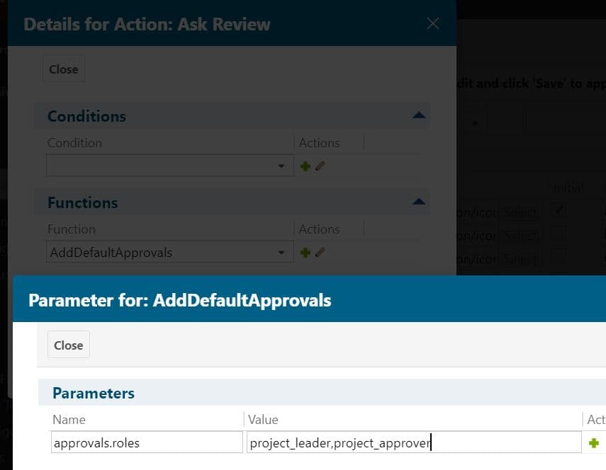 - Utiliser l’action AddDefaultApprovals et passer en paramètres la liste des rôles ou utilisateurs à déclarer sur cette transition du Workflow