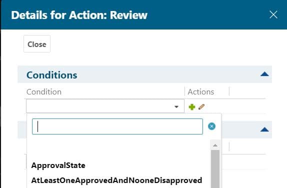 Comment conditionner le cycle de vie des exigences en fonction des approbations ? Quand une exigence est en attente de revue et que l’ensemble des approbations n’a pas été couverte nous pouvons bloquer le changement d’état de l’exigence par une condition du Workflow. Vous trouverez par défaut les conditions ApprovalState et AtLeastOneApprovedAndNooneDisapproved .