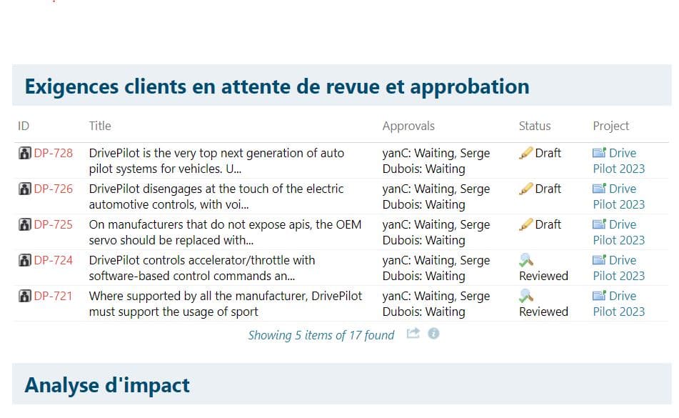 On trouve ensuite sur la page personnelle de chaque utilisateur (myPolarion) une liste des Work Items en attente d’approbation.