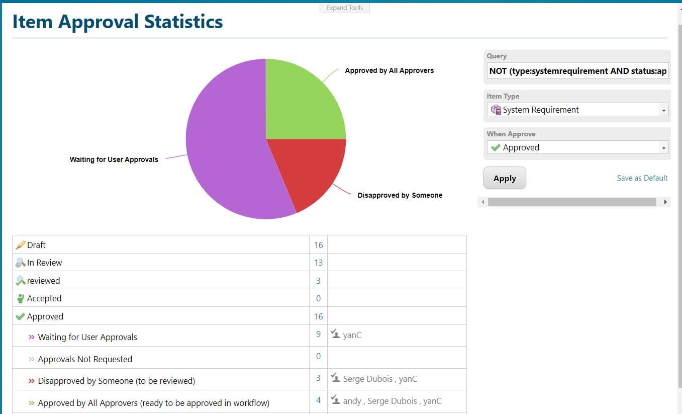 Enfin, les projets de démonstration sont livrés avec une page Item Approvals Statistics qui donne l’état d’avancement des approbations en permettant de filtrer les Work Items ciblés en fonction des paramètres présents sur la page. La technologie des pages, widgets et APIs de Polarion, permettent bien sûr de créer et personnaliser vos propres rapports. N’hésitez pas à nous consulter si vous désirez créer des indicateurs sur mesure. En conclusion : Vous avez déjà en place un processus de revue de vos exigences ou autres Work Items par vos pairs sous Polarion en utilisant les commentaires mais vous souhaiteriez être plus formel dans votre gestion, pilotage et suivi de ces revues… Alors explorez les Approvals, une fonctionnalité d’approbation efficiente et disponible avec tout type de licences / produits Polarion.