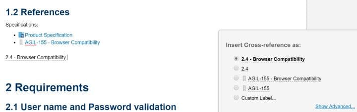 Renvoi au sein des documents (Cross-references) : Les liens vers des chapitres ou vers des Work Items permettent de naviguer dans les LiveDocs, dans le navigateur et dans les documents PDF exportés,