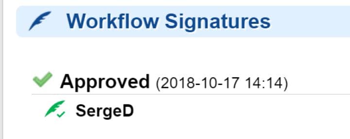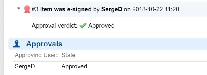 La plupart de nos clients utilise la signature électronique au niveau des documents, certains dans des domaines très régulés (par exemple, les dispositifs médicaux) doivent également gérer cette signature au niveau des Work Items (exigences, risques, cas de tests, etc.), et même au niveau des approbations (approvals) de ces Work Items. La fonction de signature des Work Items a évolué pour accroitre la visibilité et la lisibilité de ces signatures :