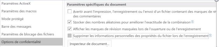 A nouveau, un paramètre du document Word. Rendez-vous dans le centre de gestion de la confidentialité et décocher « Supprimer les informations personnelles des propriétés du fichier lors de l’enregistrement ».