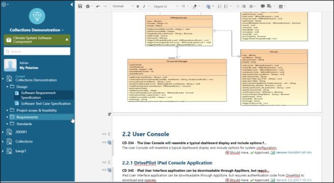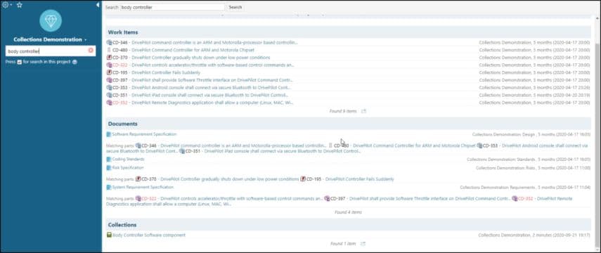 Intéressons-nous plus en détails sur ce qui est nouveau dans cette version. Gestion des Collections Pour rappel, le principe d'une Collection est de permettre de regrouper des Baselines de Documents (ou révisions de Documents), ou une même révision d’un document peut être réutilisée dans plusieurs collections si nécessaire. En suivant cette approche, les Collections sont notamment appropriées pour les besoins de vérifications et de conformité réglementaire. Les Collections peuvent aussi être utilisées pour travailler sur un ensemble de documents, certains en version courante, d'autres figés sur des révisions données (ou Baselines de documents). Les Collections permettent de se placer dans un contexte précis et facilitent la création de liens entre révisions des documents et révisions des Work Items. Une fois le travail sur les documents de la Collection achevé, celle-ci peut être alors fermée ou figée sur une révision donnée. Par cette approche, les Collections soutiennent la couverture des activités de développement parallèles ou concurrentes dans un cycle de conception en V. Ajout de documents aux Collections d'autres projets Il est maintenant possible d’ajouter des documents issus d'autres projets à vos collections. La barre de navigation affiche le projet source et le dossier qui contient le document. Ceci permet de suivre et comprendre aisément l’origine des documents