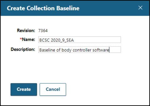 Les Collections ont été initialement développées pour améliorer la fonctionnalité Baseline. Reprenant le concept d’une Baseline de Document, une Collection peut désormais être mise en Baseline. Lorsqu’une Collection est « baselinée » elle reste dans un état ouvert et vous pouvez continuer à travailler. Vous pouvez à tout moment revenir en arrière avec à la vue History pour visualiser toutes les Baselines antérieures qui sont associées à une Collection et ouvrir l’une d’elles au besoin. Vous pouvez décider de fermer la Collection à tout moment.