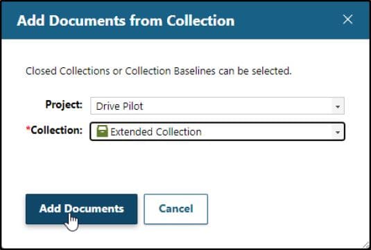 Les Collections ont évolué afin de pouvoir prendre en charge plusieurs scénarios de réutilisation. Tout d’abord en travaillant dans une Collection, il est possible d’y inclure tout document présent dans une autre Collection fermée ou baselinée. Vous pouvez également sélectionner des Collections venant d’un autre projet. Cela signifie que si vous devez réutiliser le contenu complet d’une Collection, vous le ferez en une seule opération plutôt que d’avoir à ajouter manuellement les Documents en choisissant leurs versions ou Baselines associées.