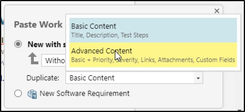 La réutilisation d’un Work Item par copier-coller dans un même document a été améliorée afin d’inclure tous les attributs du Work Item. Il est maintenant bien plus simple de diviser une exigence en plusieurs exigences, ou de dupliquer des exigences similaires. Semblable à la copie inter-documents, ce scénario dans un document vous offre plus d’options pour dupliquer uniquement le contenu de base ou pour copier des attributs supplémentaires et des champs personnalisés. Vous pouvez également lier tout Work Item nouvellement créé à celui d’origine.