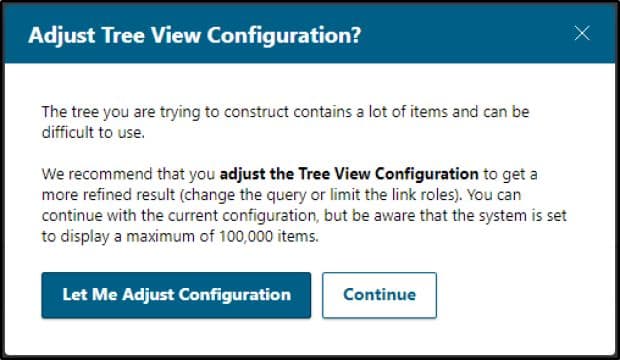 L'affichage de la vue hiérarchique des Work Items dans Polarion peut être une opération très consommatrice de ressources (on pourrait calculer un arbre à partir de centaine de milliers de Work Items). Afin de limiter l’impact d’un seul utilisateur sur l’ensemble du système, une nouvelle limite de recherche et d'affichage des données a été fixée. Désormais, après avoir analysé au maximum 20 000 Work Items, Polarion notifiera l'utilisateur en lui proposant d'affiner sa recherche pour empêcher une allocation excessive des ressources du serveur.