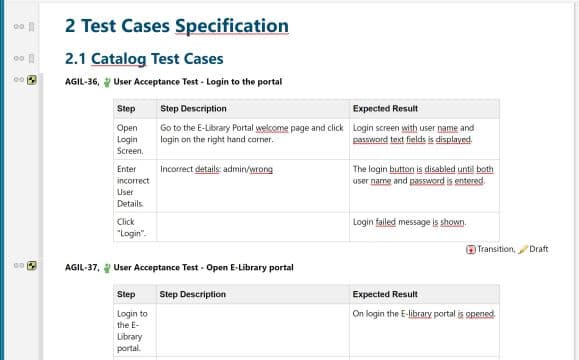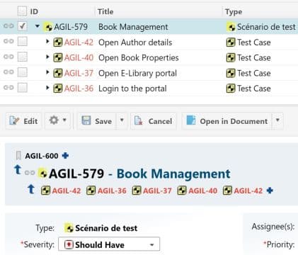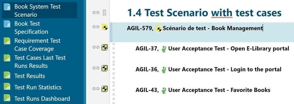 Ces cas de tests sont donc spécifiés dans un ou plusieurs LiveDocs, par exemple selon un découpage fonctionnel, l'ensemble de ces documents représentant notre catalogue de tests. A ce stade, il n'est pas encore nécessairement de considérer l'ordonnancement de ces tests. Pour rappel, les cas de tests manuels sont décrits sous la forme d'étape de tests.