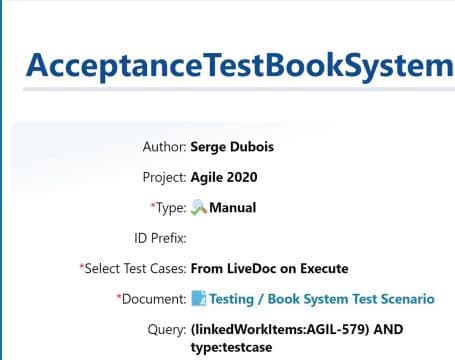 - Spécifier dans Query la requête qui conditionnera la sélection automatique des tests à dérouler et les rendra exécutable. Dans notre exemple, en plus de la sélection par le document, la requête linkedWorkItems:AGIL-579 a aussi son importance ; elle permet de ne prendre en considération que les cas de tests couvrant le scenario portant cet identifiant.