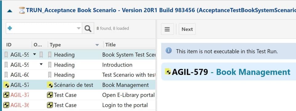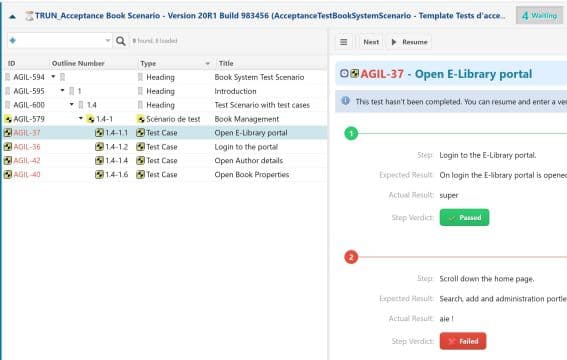 A partir de ce Test Run Template, nous pouvons donc créer un Test Run et dérouler les tests, étape par étape. On peut constater que le scénario est également représenté dans l'arborescence du fait de la structuration entre ce scénario et les cas de tests dans le document.