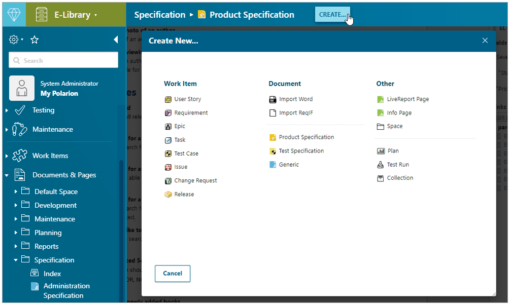 Un bouton configurable « Create » permet aux utilisateurs de créer facilement de nouveaux artefacts, où qu’ils se trouvent dans Polarion.