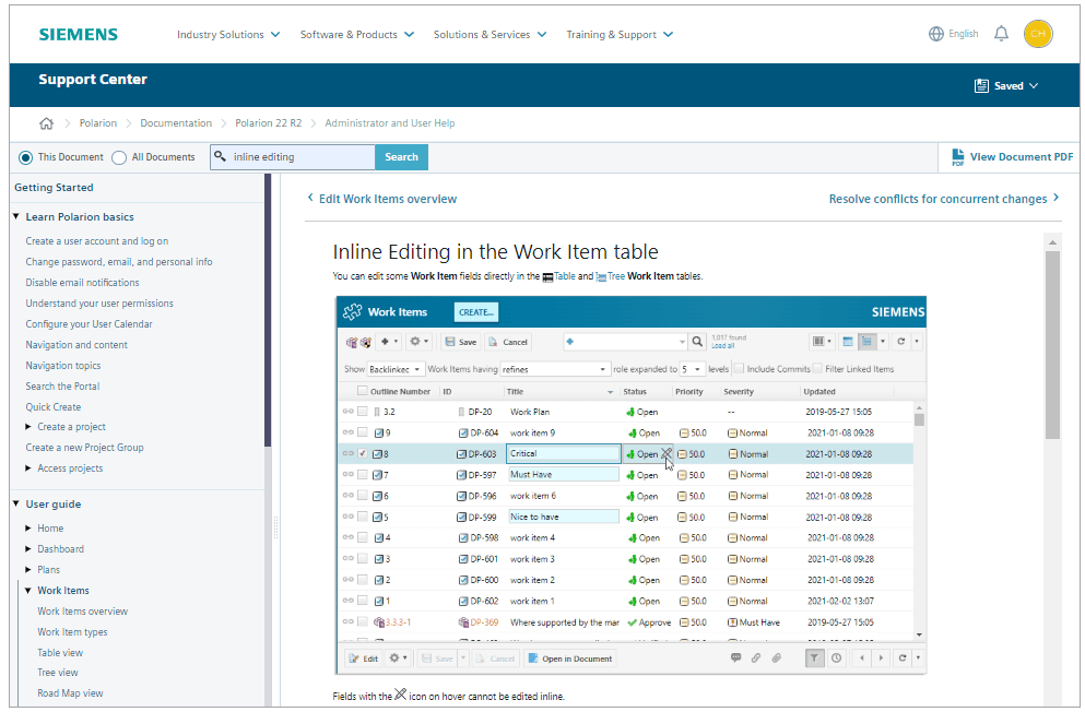 Une fonctionnalité qui nous a souvent été demandée : vous pouvez désormais directement modifier certains champs de Work Items sur la vue table de Polarion, y compris sur la vue arborescente. Il suffit de double-cliquer sur un champ modifiable d’un Work Item pour activer l’éditeur. Les champs éditables sont surlignés en bleu jusqu’à leur sauvegarde.