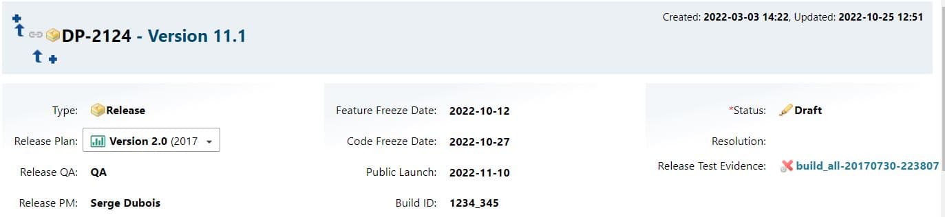 Cette version cible est donc en soi un objet, et un objet sous Polarion se représente sous la forme d’un Work Item. Comme nous pouvons le voir dans la capture ci-dessous, la release peut être associée à des attributs comme la date de lancement, les Test Runs prouvant sa qualité, etc.