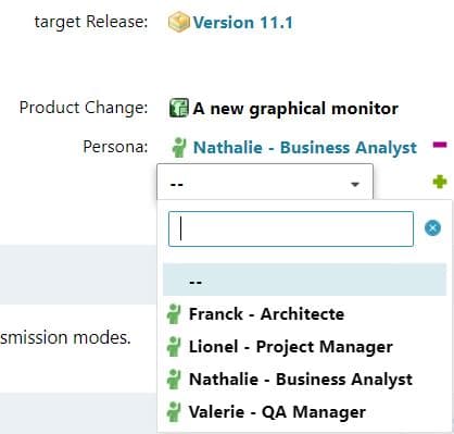 le contenu du champ est cliquable, ceci veut dire que je peux aisément naviguer de mon exigence à ma version 11.1, ou encore pour les deux autres exemples donnés ci-dessous naviguer vers les personas (un autre type de Work Item) ou naviguer vers le Product Change en cliquant sur l’icône verte (encore un autre type de Work Item).