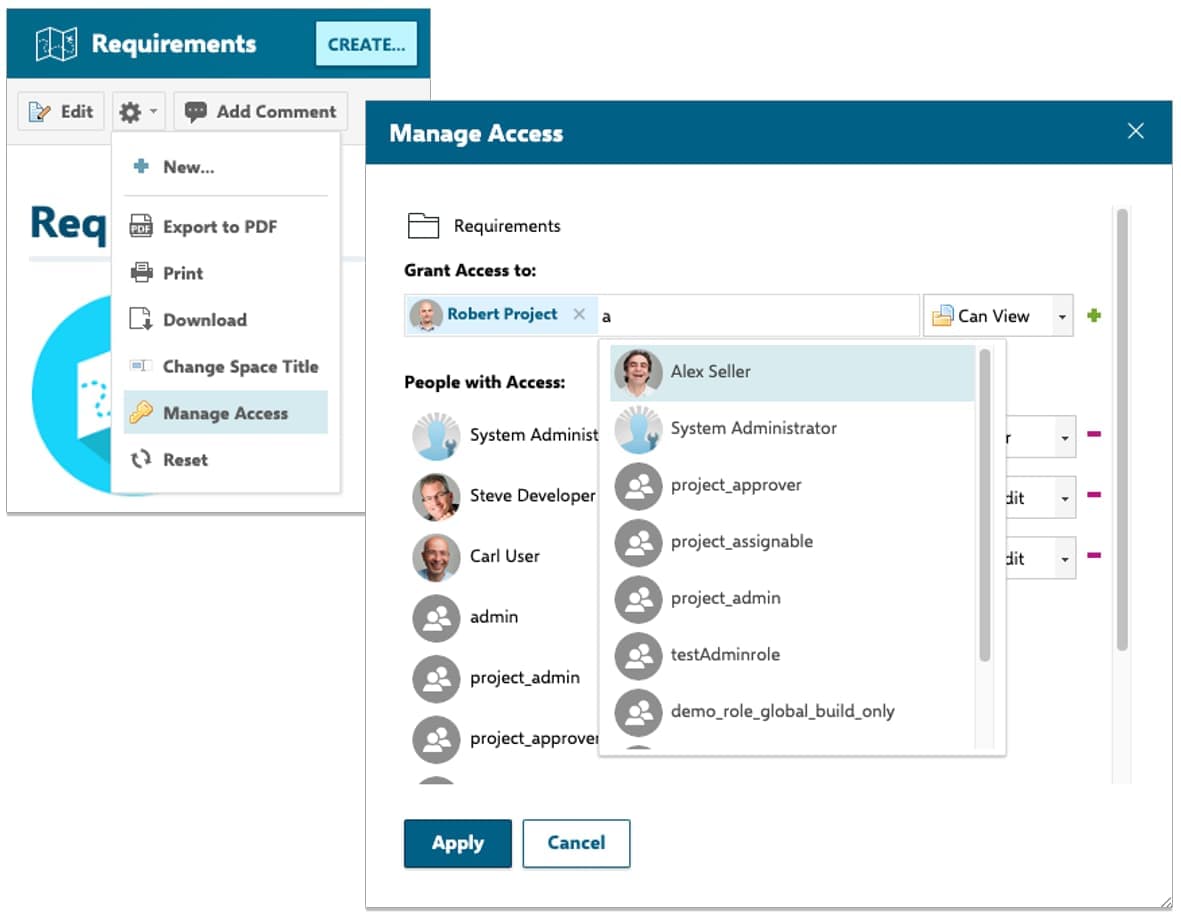 - Can View : Les utilisateurs peuvent consulter les espaces, les pages et les documents, y compris les work items qu'ils contiennent (à condition d'avoir l'autorisation de lecture sur les objets eux-mêmes),
