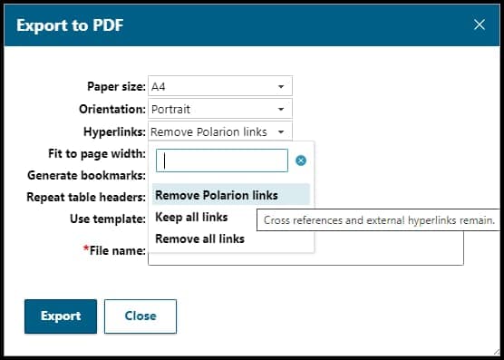 - Options additionnelles : les utilisateurs peuvent choisir entre « Keep all links», ce qui conserve le comportement habituel de Polarion, et « Remove all links», qui suppriment tous les liens hypertexte du document PDF.