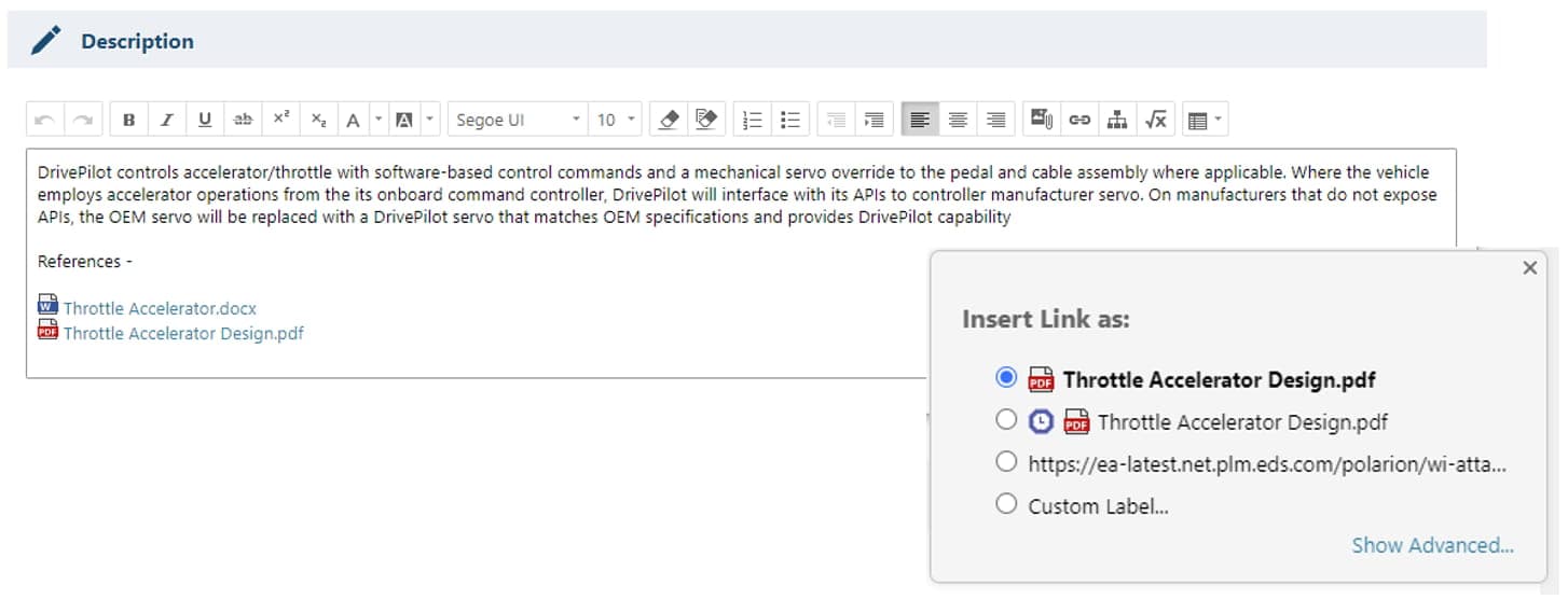 Améliorations apportées à l’éditeur Rich Text Dans Polarion 2310, l’éditeur de texte intègre deux améliorations significatives pour rendre la création de contenu encore plus conviviale Références de pièces jointes en Rich Text Vous pouvez désormais coller facilement des liens esthétiques vers des pièces jointes directement dans votre document Rich Text. Cela ajoute des labels explicites avec des icônes pour les liens des pièces jointes. Sont pris en charge les pièces jointes liées aux Work Items, aux Pages, aux Modules et aux Test Runs, ainsi qu’une icône d’horloge et une info-bulle de révision pour les liens de Baseline.