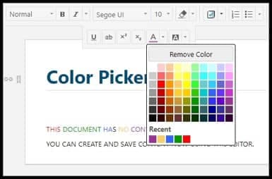 Réutiliser les couleurs récentes L’éditeur présente désormais jusqu’aux dix dernières couleurs utilisées par chaque utilisateur pour les polices et les arrière-plans de police. Ces couleurs sont stockées dans les préférences de l’utilisateur et sont accessibles à partir de n’importe quel éditeur Rich Text de Polarion. La barre d’outils est enrichie des dernières couleurs utilisées qui sont affichées sous la palette de couleurs disponibles.