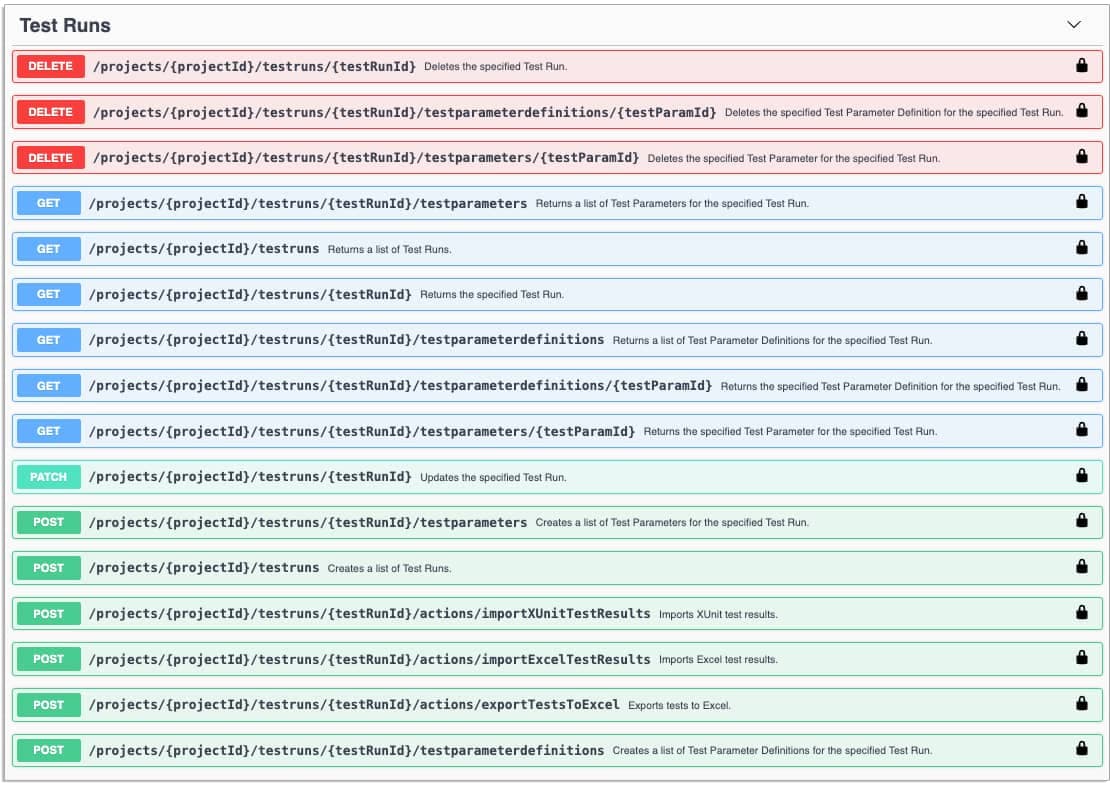 - Gestion des tests : Support des différentes activités de test, actions CRUD (Créer, Lire, Mettre à jour, Supprimer) sur les objets Test Run, importation et exportation des résultats des cas de test. Notez que l'exécution des tests utilisant un contexte d'exécution sécurisé n'est pas prise en charge par l’API REST.