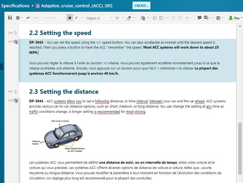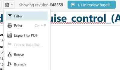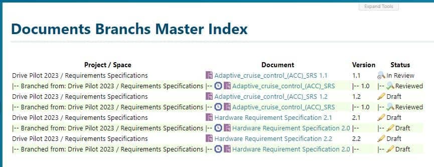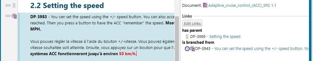 - Suivant le choix retenu lors de la création de la branche, cette exigence dans ce document se verra présentée, ou pas, avec les changements opérés dans le document Master. Dit autrement (vite un exemple car cela se complique !), si je passe la vitesse de 40 km/h à 50 km/h dans le document de référence, je verrai aussi 50 km/h dans la branche car l’exigence est la même dans les deux documents, ce n’est pas une copie, c’est une référence.