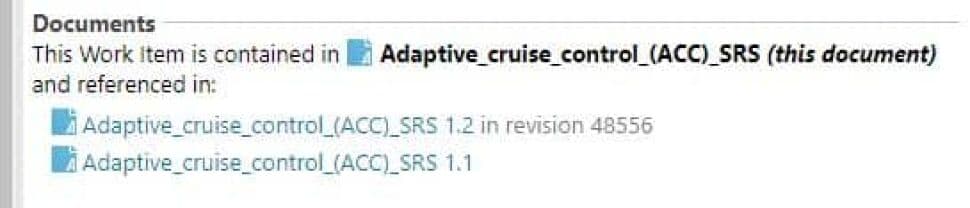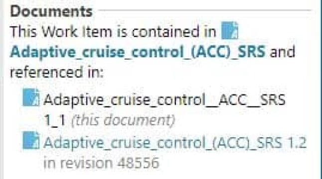 Notez le trait vertical discontinue sur le côté gauche de l’exigence dans le document branche, cela signifie que l’exigence est ici référencée :