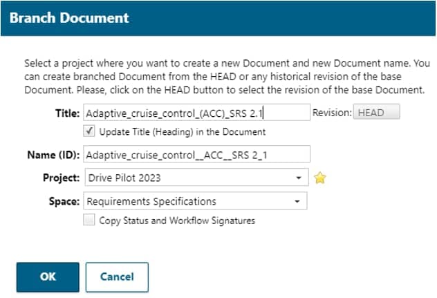 - Bulk Branching : Vous pouvez rapidement et facilement créer des branches de documents ou des copies de plusieurs documents tout en maintenant des liens relatifs, facilitant ainsi les transitions dans votre processus de développement.