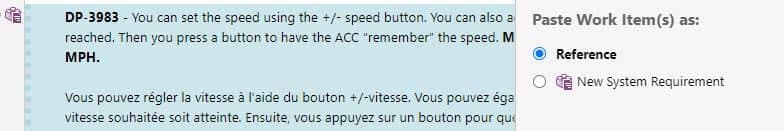 - Liens entre Documents : Les documents copiés sont liés à leurs documents sources via le champ « branched from », préservant les liens entre eux. Les work items copiés sont également liés à leurs items sources via le lien « branched from », permettant une gestion et un suivi efficace des liens entre work items.